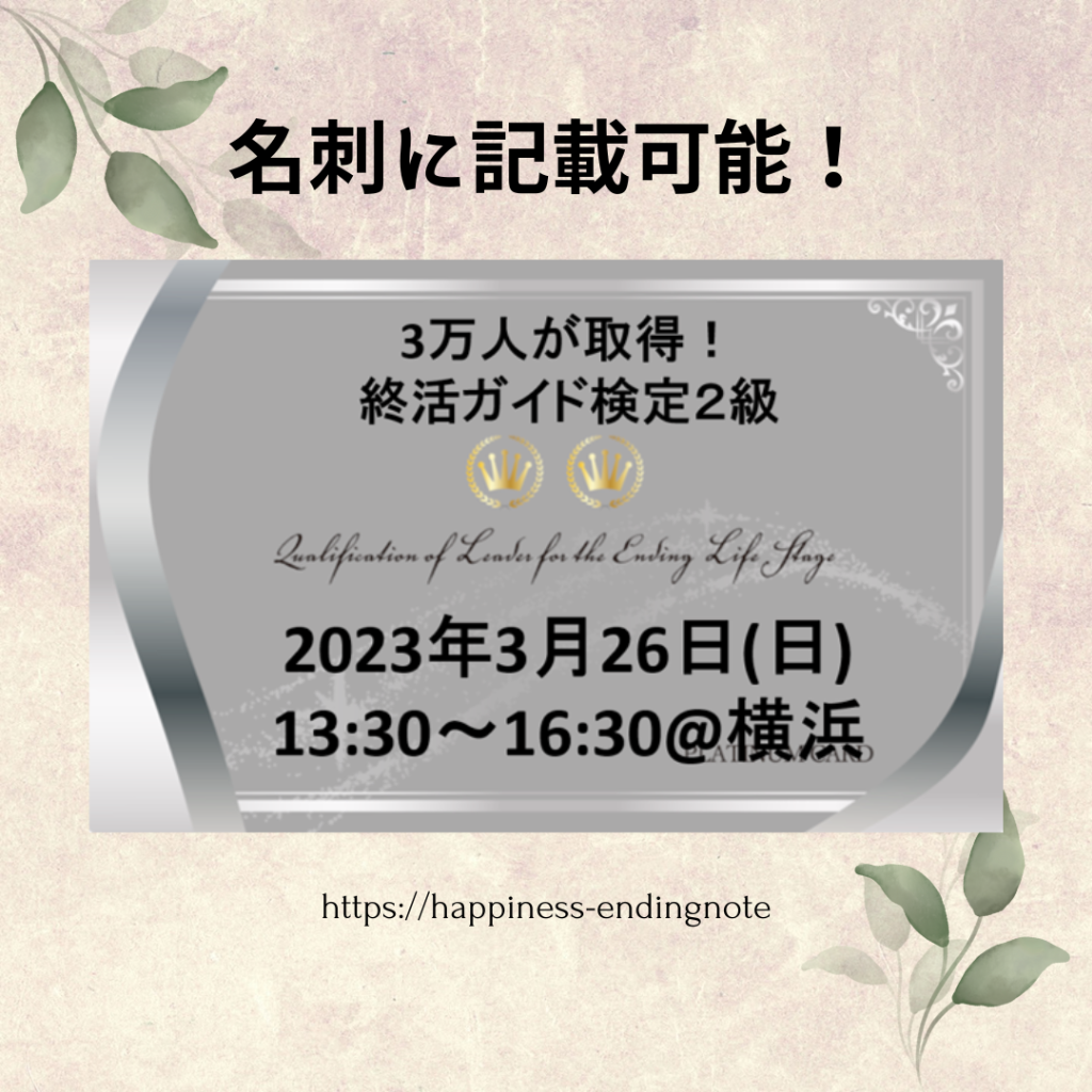 名刺に記載可能!終活ガイド検定2級開催!2023年3月26日(日)13時半~16時半@横浜駅